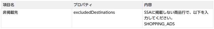 商品フィードに以下の項目を追加することで、指定した商品はSSAに掲載されなくなる。