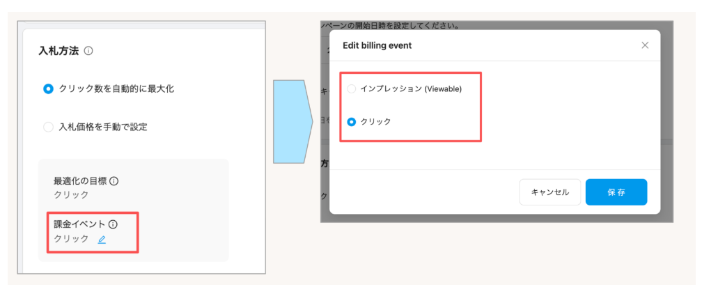 オークション方式に「インプレッション(Viewable)課金イベント」を追加。キャンペーン作成時に「クリック課金」「インプレッション課金」のどちらかを選択が可能に。