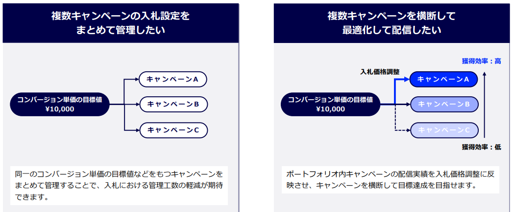 「ポートフォリオ入札」とは、アカウント単位で入札戦略を作成し、複数のキャンペーンに設定できる機能。