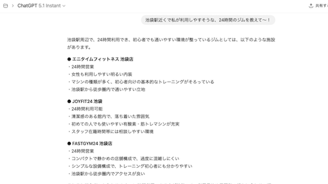 特にフィットネスジムは、料金・設備・通いやすさ・トレーナーの質など、比較検討項目が多く、AIが整理した情報を参考にしながら意思決定が行われやすい領域です。