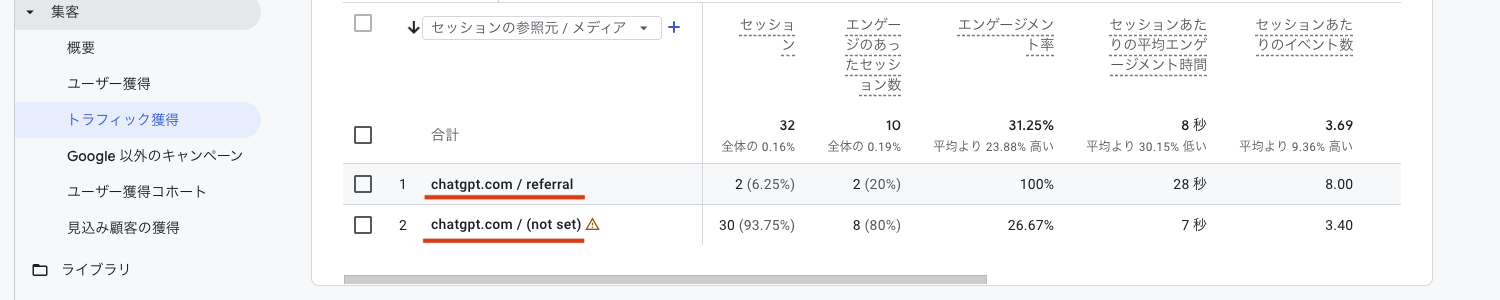 GA4では、参照元(referral)に「chatgpt.com / referral 」や「perplexity.ai / referral 」が出る場合があり、AI経由の訪問を把握できます。