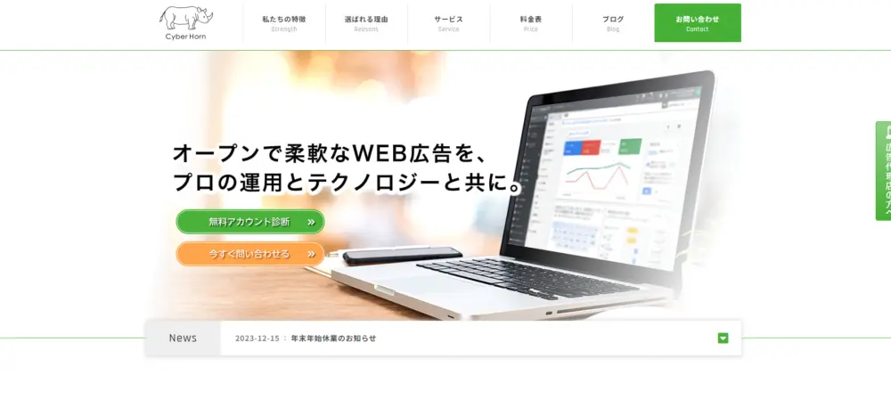 サイバーホルン株式会社は、Web広告運用に特化した代理店で、LINE広告においても専任の運用担当者がきめ細かなサポートを提供しています。LP制作や動画制作といったクリエイティブ制作もワンストップで依頼可能です。